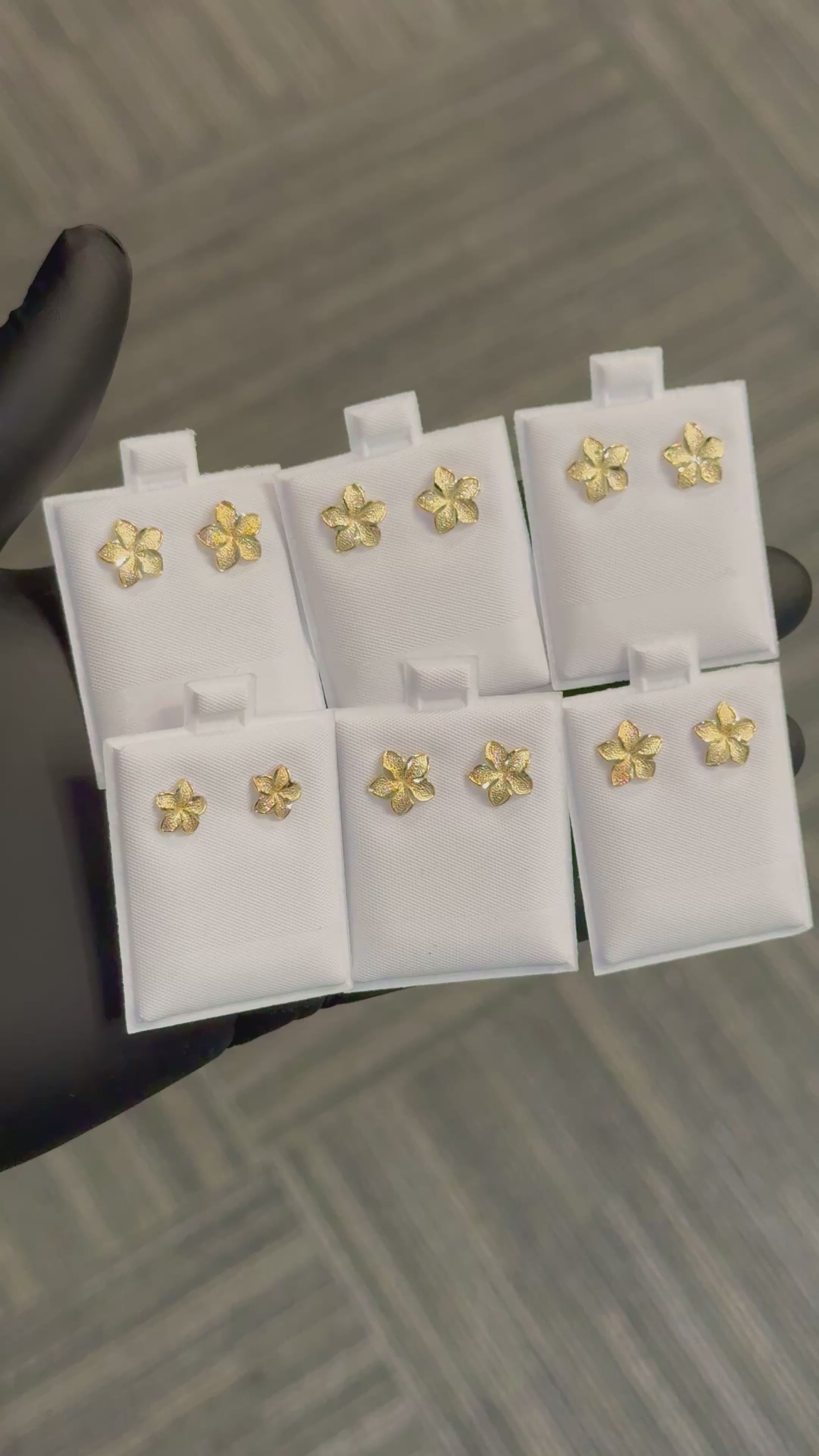 ~ 10k Hibiscus Earrings with Textured Mirrored Finish and Diamond Dust