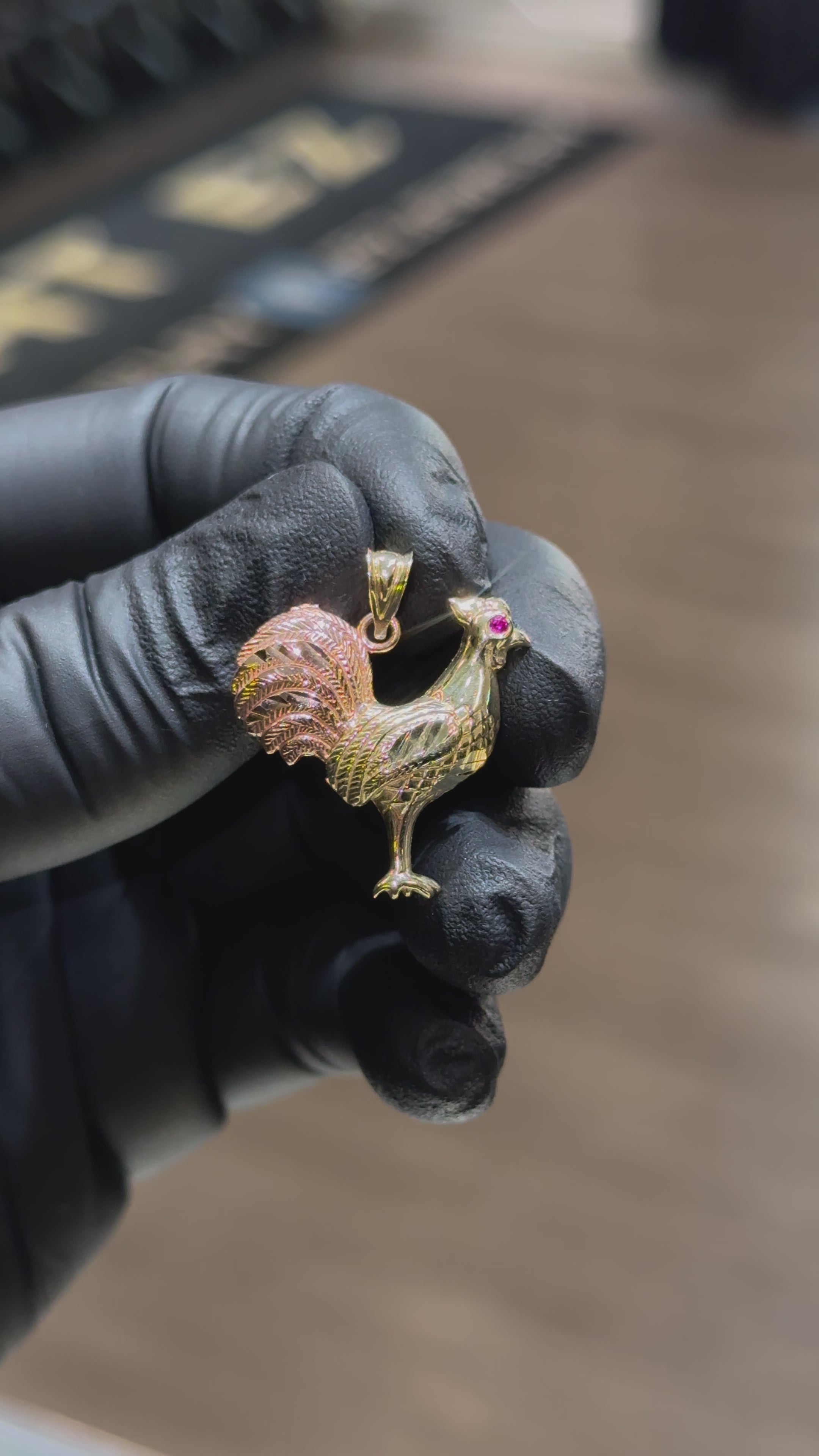 ~ 10k Two-Tone El Gallo (Rooster) Pendant with Diamond Cut Details with red ruby eye