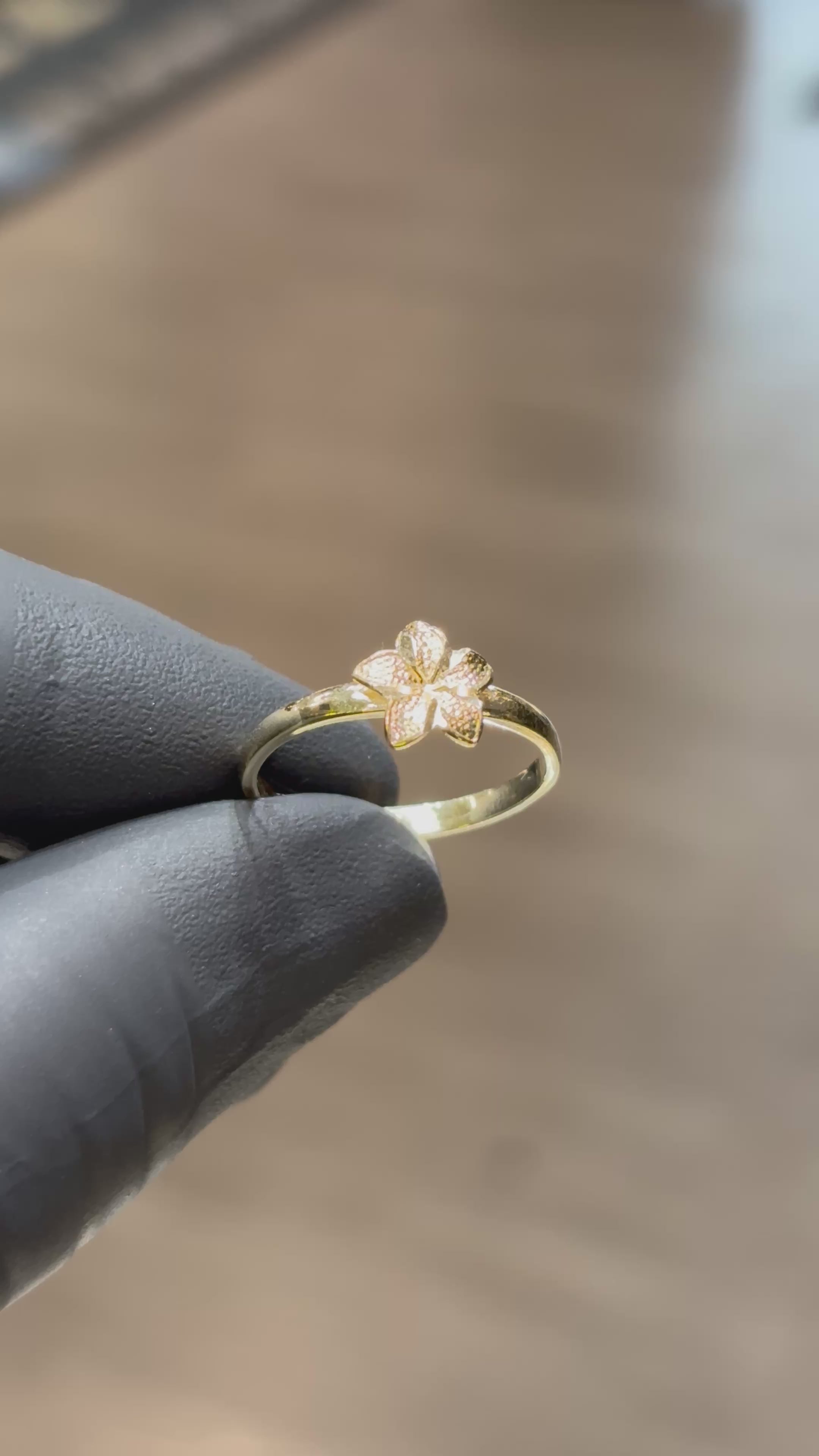 ~ 10k Small, 3D Hibiscus Ring with Diamond Cut Detailing