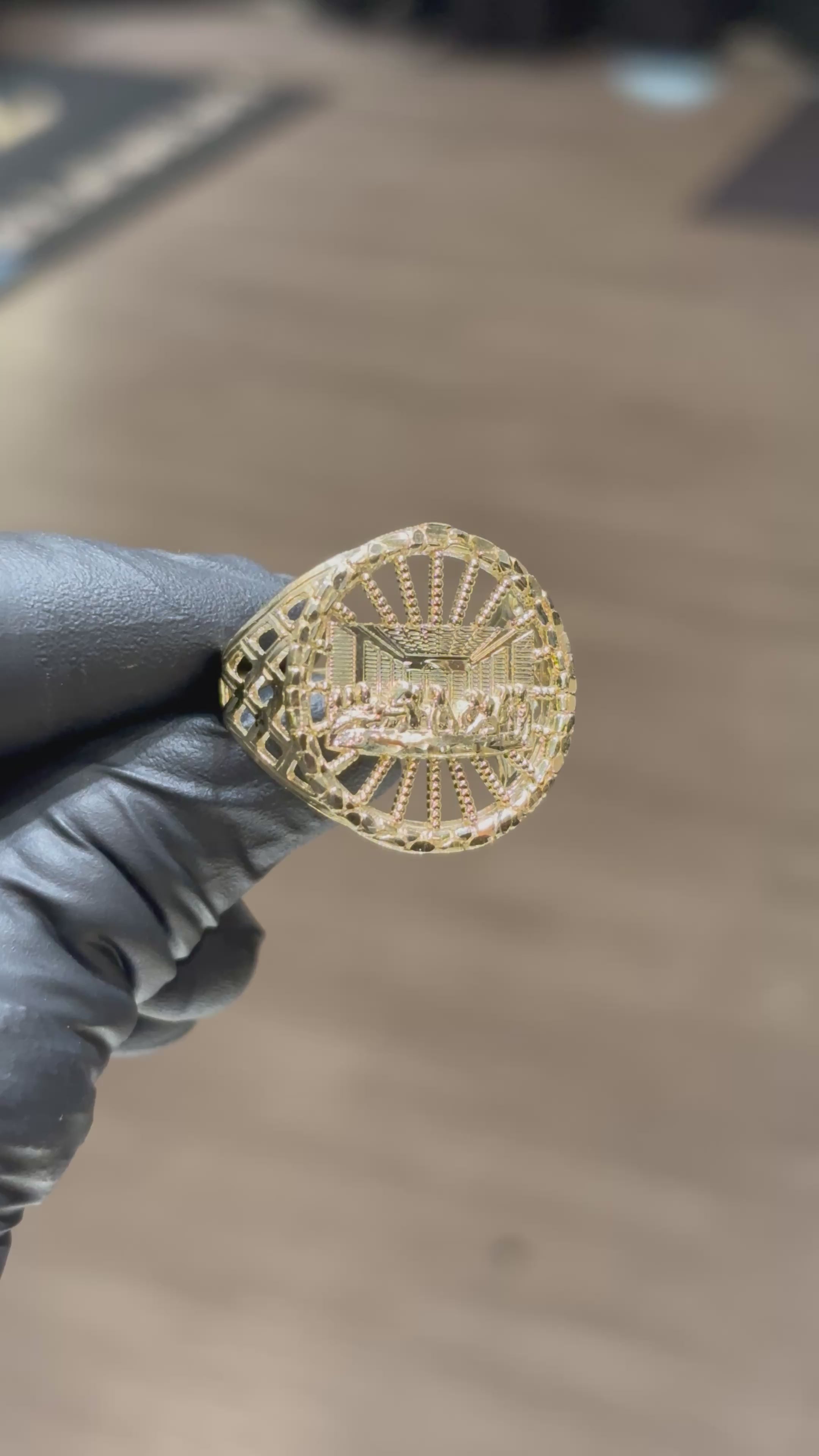 ~ 10k Single-Casted, Circle Cutout Last Supper Ring with Nugget Textured Border and Diamond Cut Border with Illusion Beaded Design