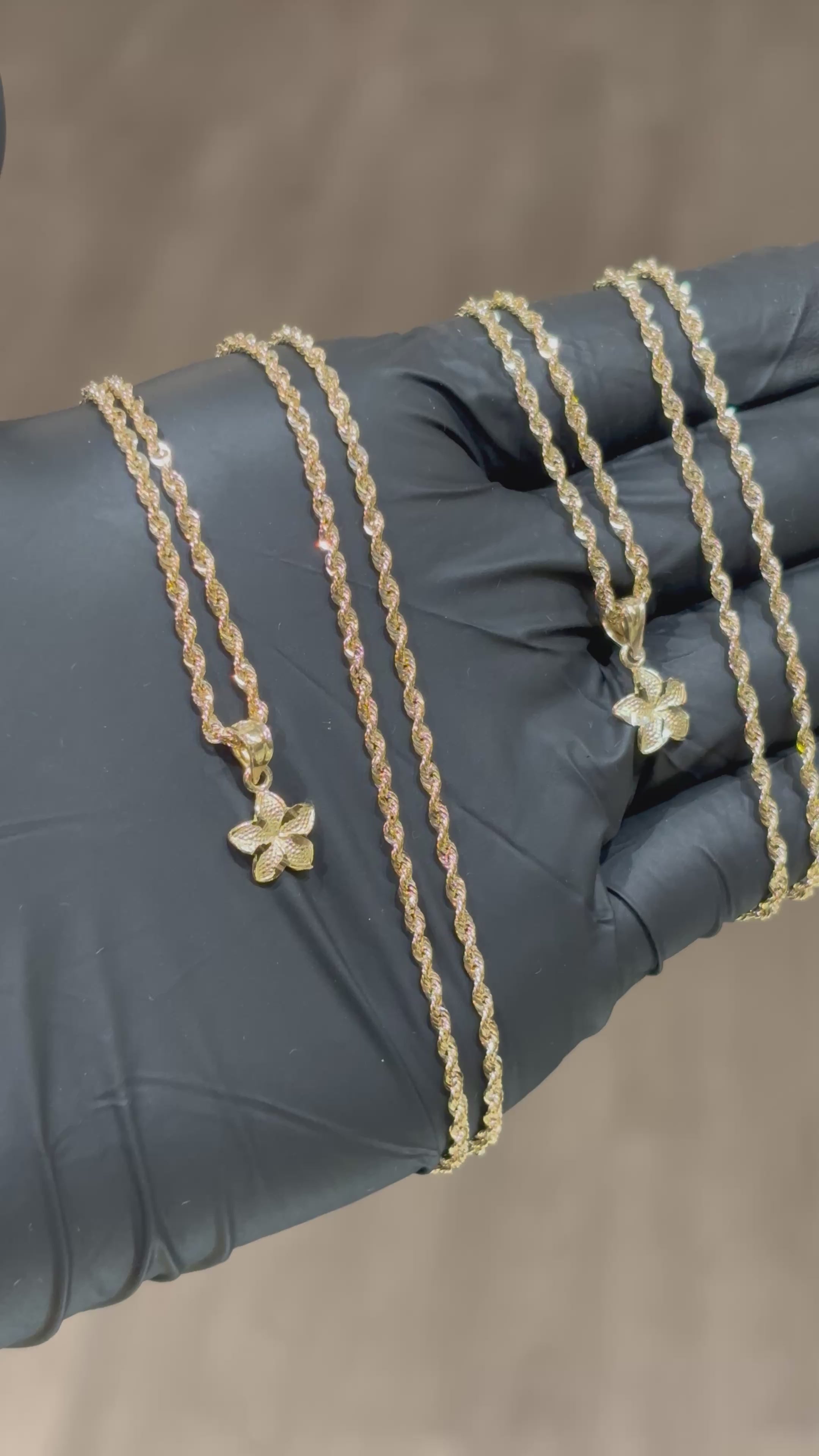 ~ 10k Small Hibiscus Diamond Cut Pendant Paired with a 1.9 mm 24" Laser Cut Rope Chain