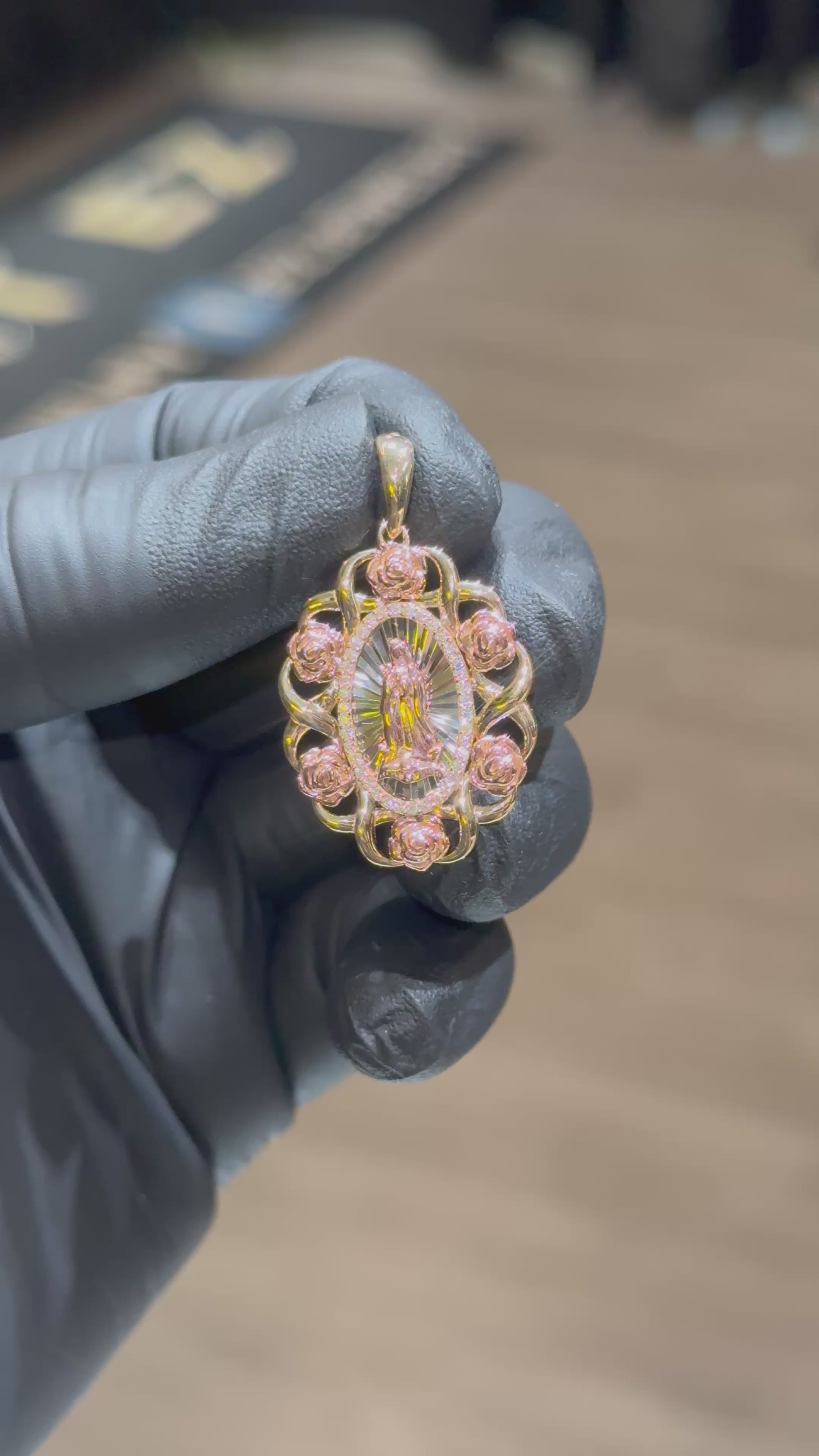 ~ 10k Large two-Toned, Crystal Encrusted, Virgin Mary Pendant with 3D Rose Frame and Solid Illusion Cut center