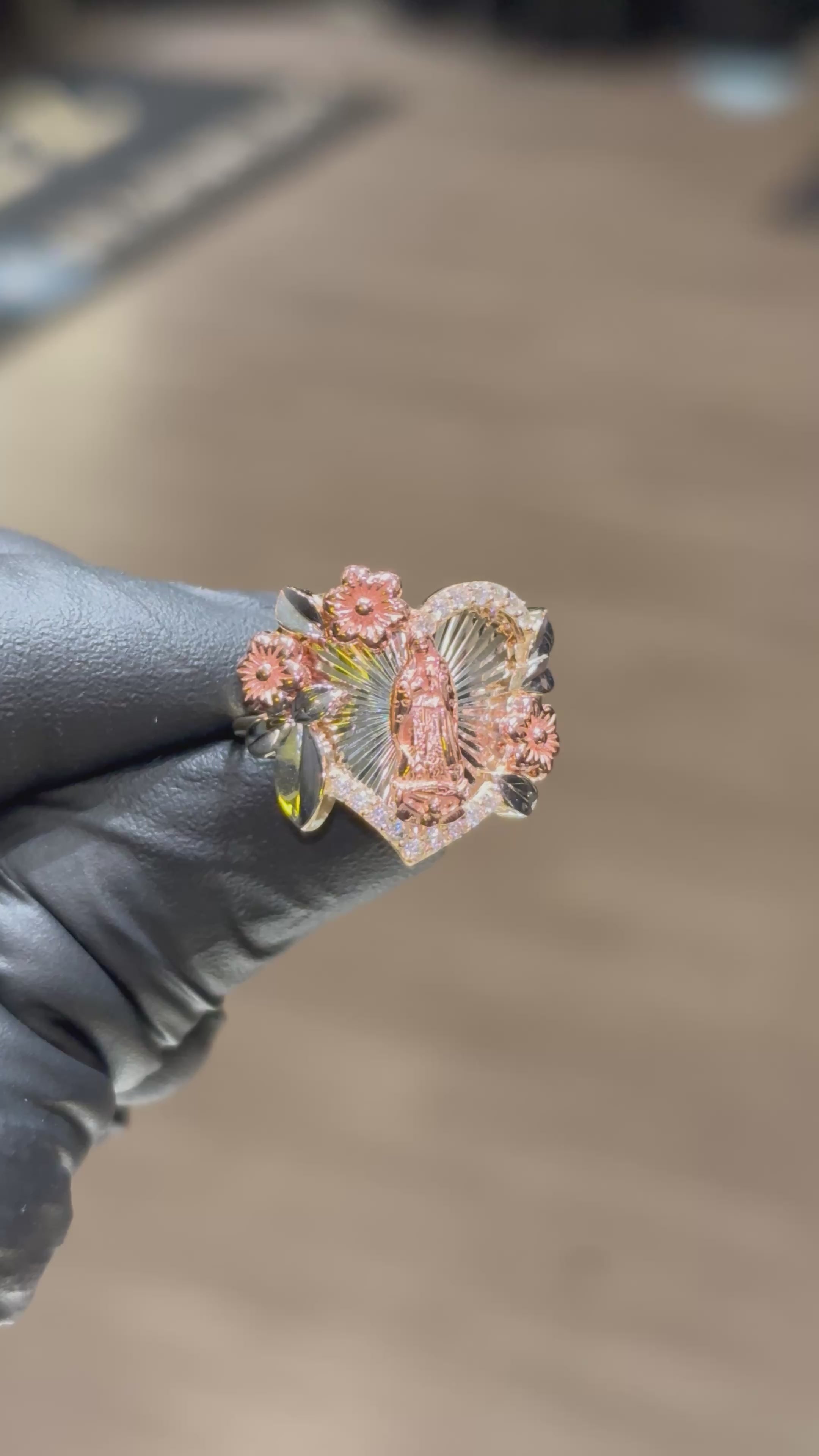 ~ 10k Single-Casted Triple-Toned Virgin Mary Ring with Illusion Cut Background and Embossed Flower Detailing
