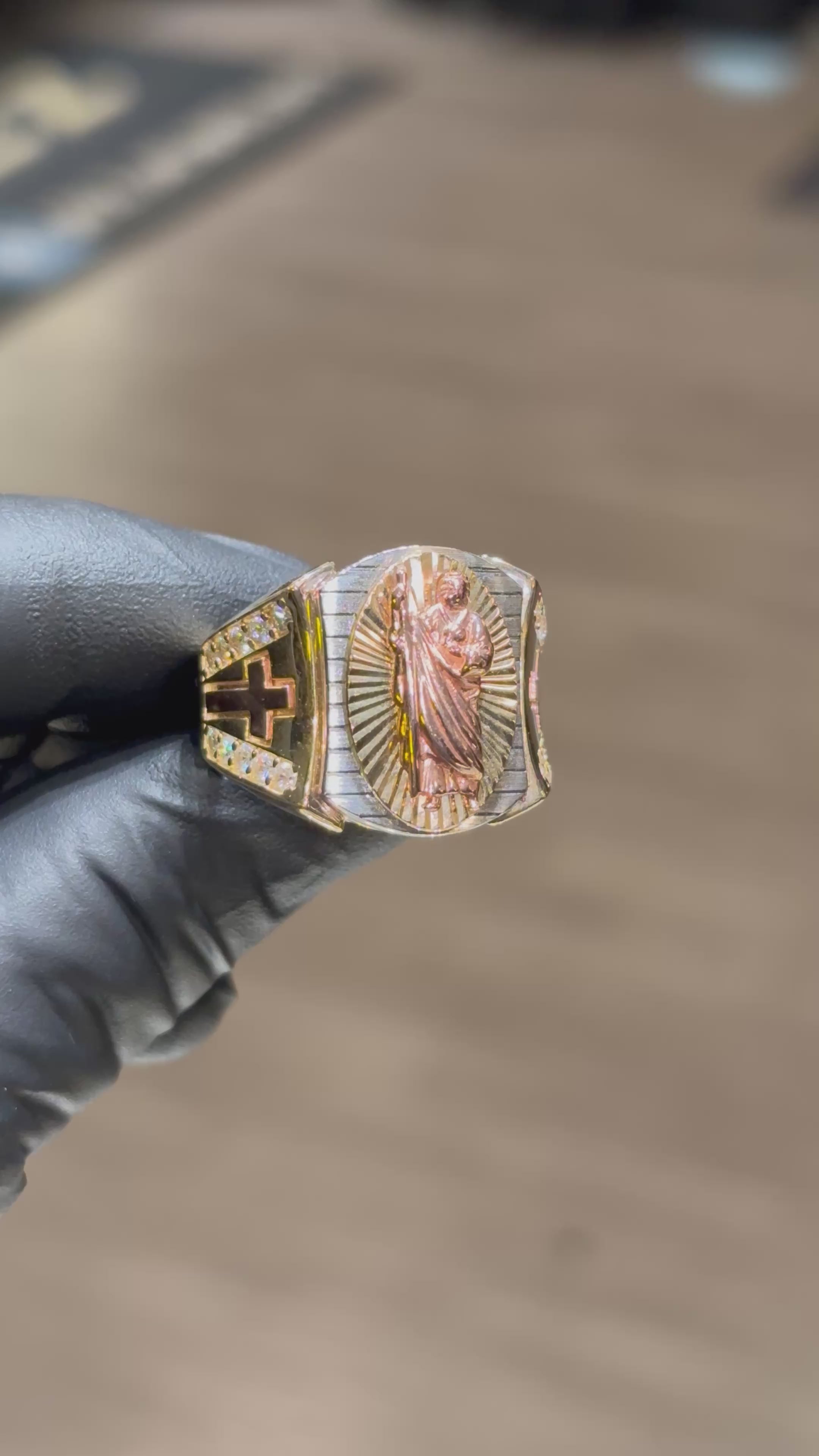 ~ 10k Single-Casted Triple-Toned San Judas/ Cross ring with Religious Embossed Detailing and Crystal Encrusted Edges