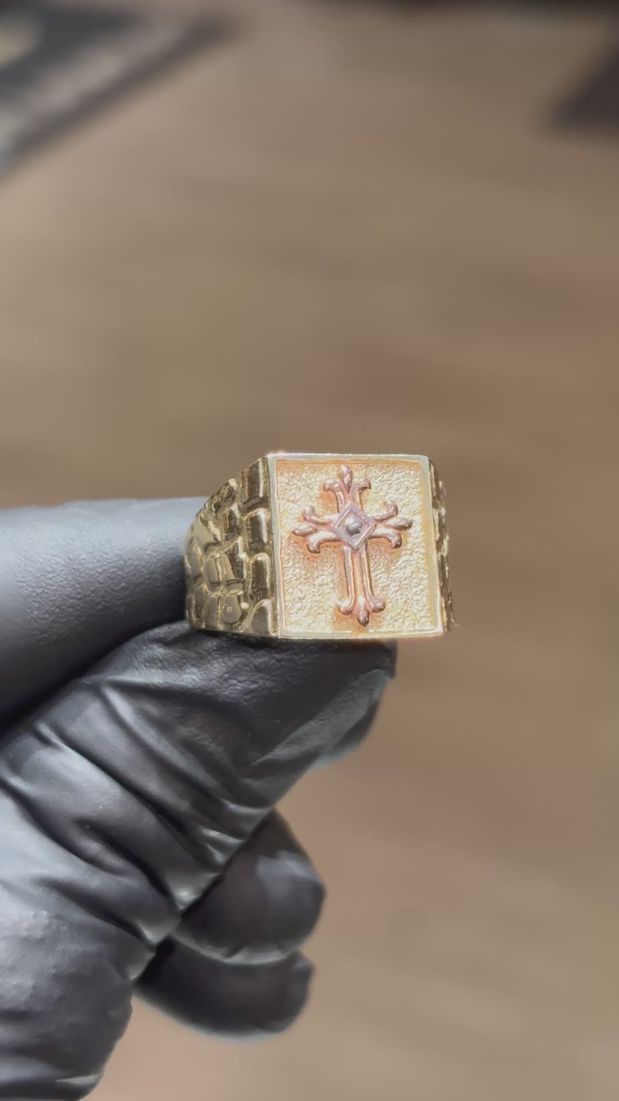 ~ 10k Single-Casted, Triple-Color Embossed French Chrome Hearts Cross Ring with Nugget Band