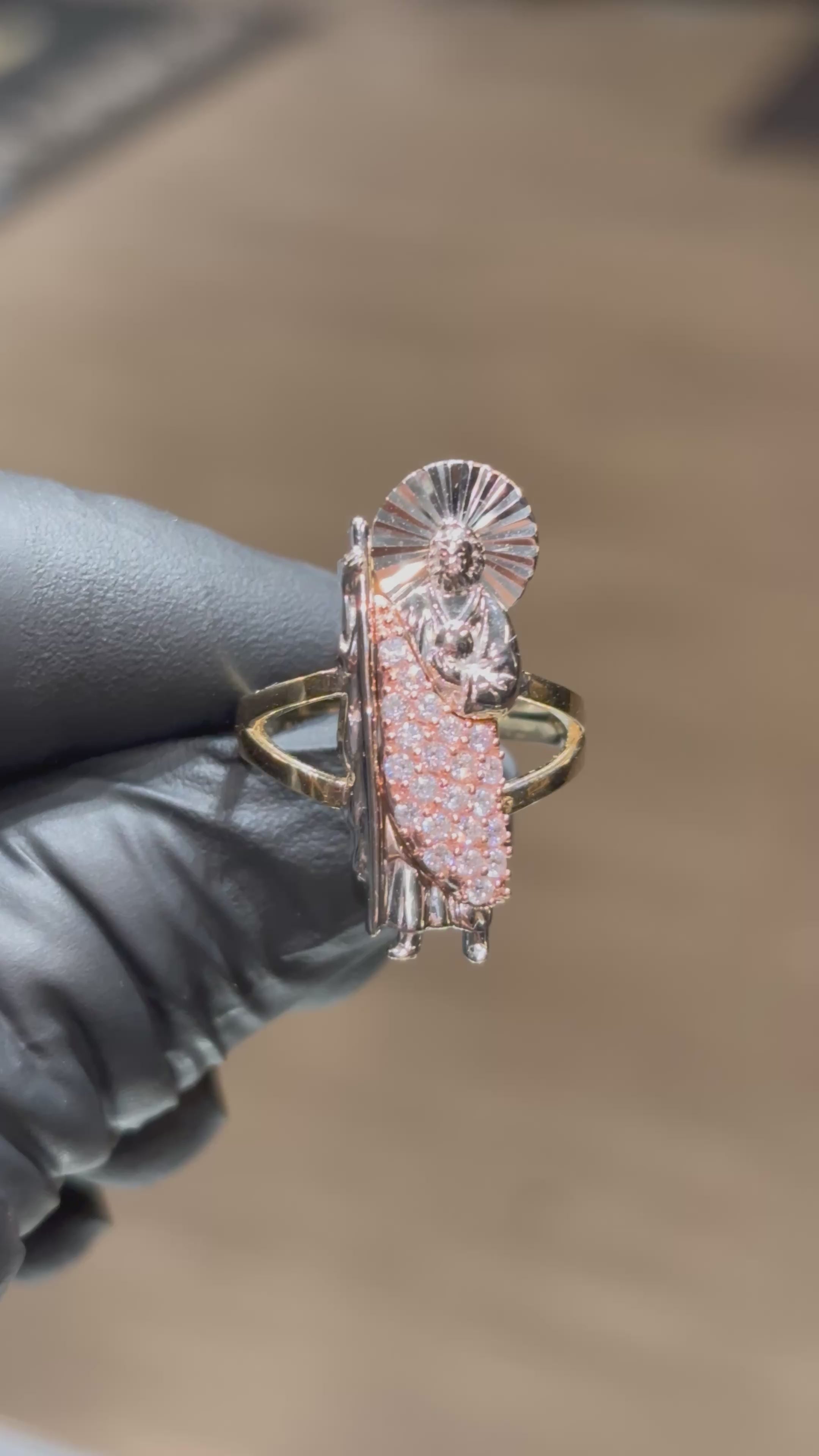 ~ 10k Silver-Toned Full Body San Judas Ring with a Rose Gold Accent, White Crystal Encrusted, and a Split Gold Band