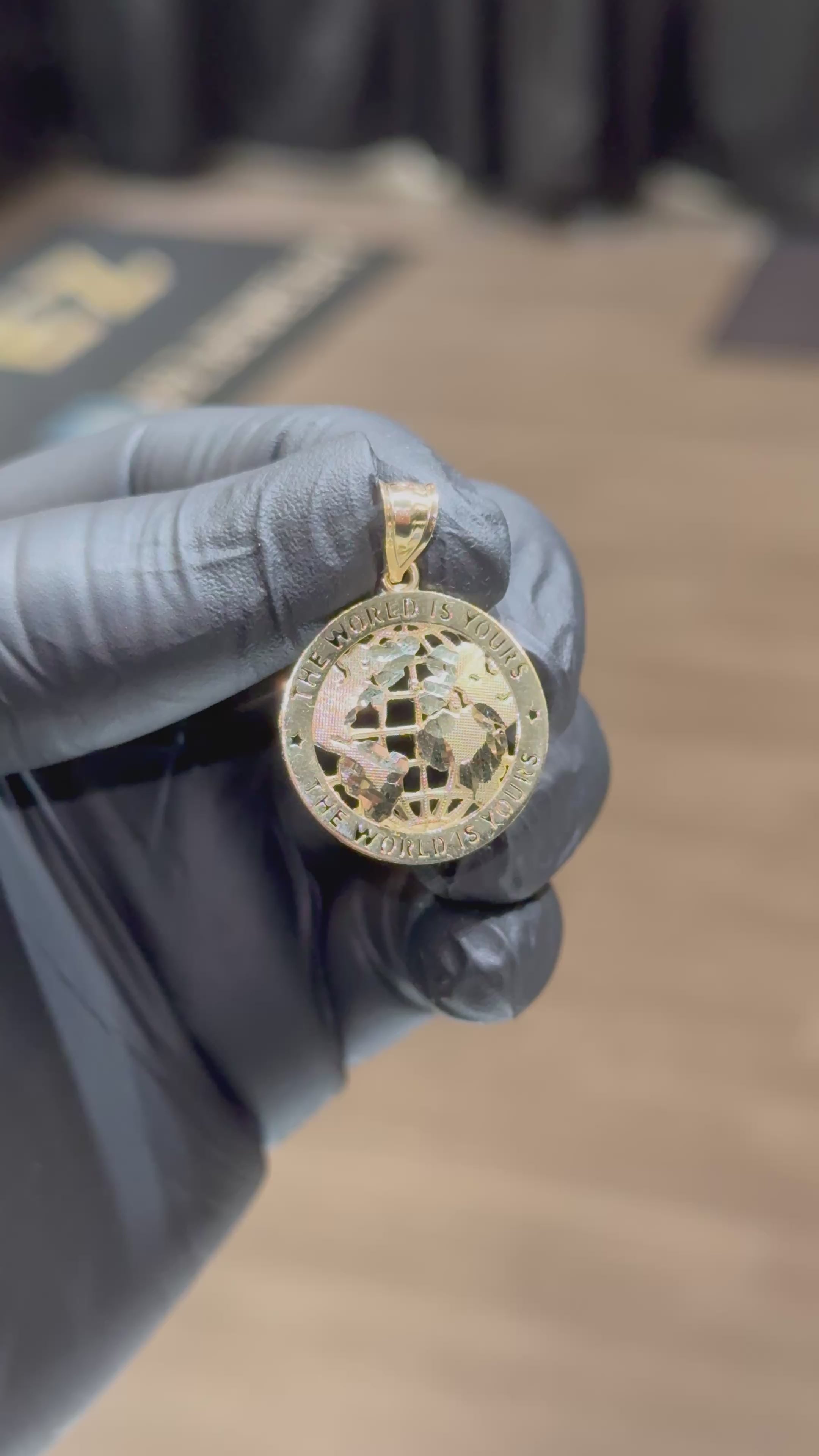 ~ 10k Cage-Style Cutout "The World Is yours Pendant" with Diamond Cut Detail