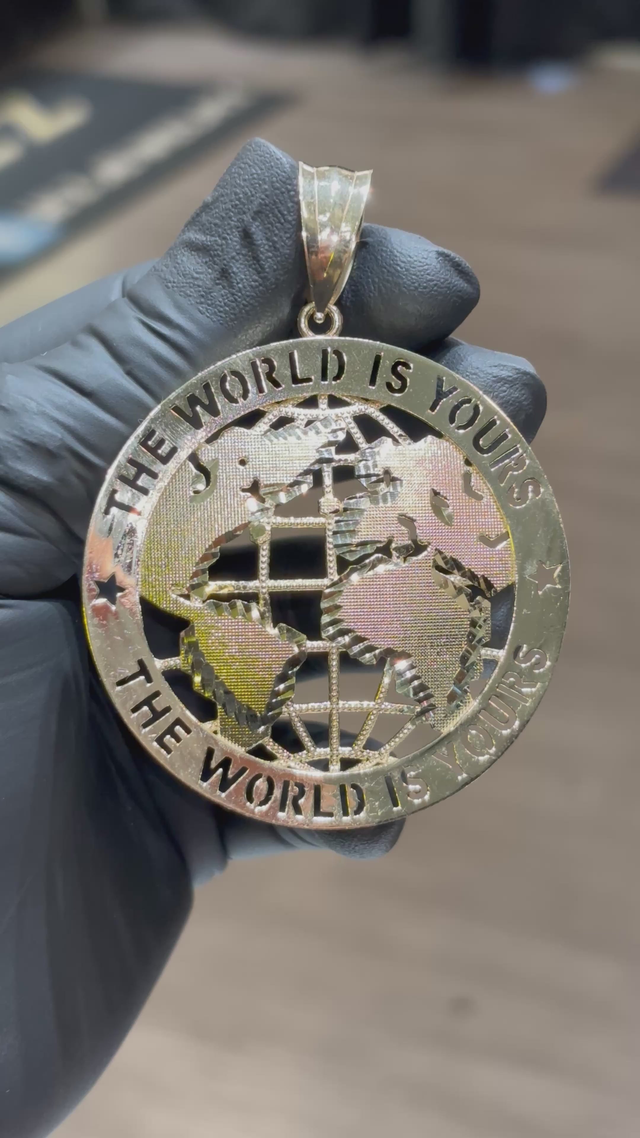 ~ 10k XXL Cage-Style Cutout "The World Is yours Pendant" with Diamond Cut Detail